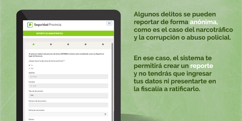 Algunos delitos se pueden denunciar de forma anónima, lo que en el sistema se denomina "reporte". En este sentido, podrás reportar narcotráfico y corrupción o abuso policial. A diferencia de la denuncia, el reporte no se ratifica. El fiscal intervendrá de oficio de acuerdo a lo establecido en el artículo 6 del Código Procesal Penal de la Provincia.